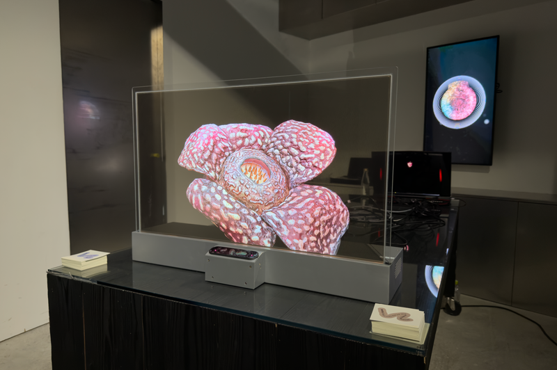 映像上映に続いて、参加者は透明なディスプレイ上に浮かび上がるまるでホログラムのような3D植物アセットに、手をかざす・動かすと反応するという近未来的体験をしました。非接触操作が可能なインターフェースとして、xTraceディスプレイが活用されており、スキャンされた植物データが“物理的ではないのにそこにある”ように感じられる演出を行いました。
