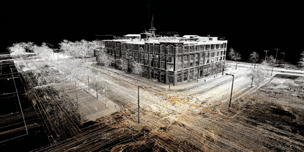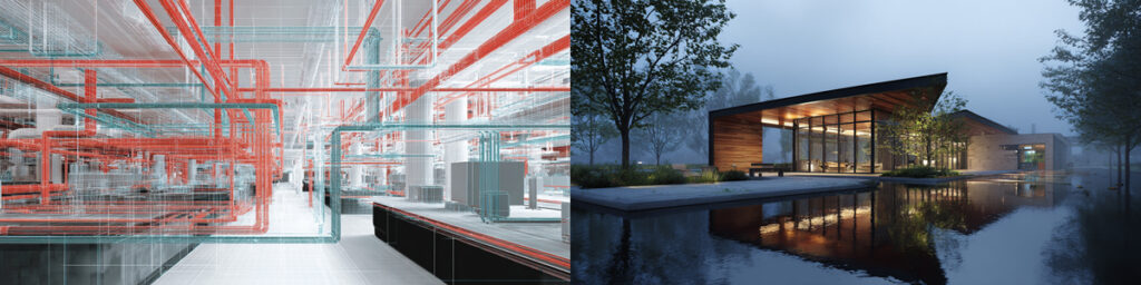 ▶ 建築用途:LiDAR点群 → 図面 → BIM → 3DCGパース → デジタルツイン