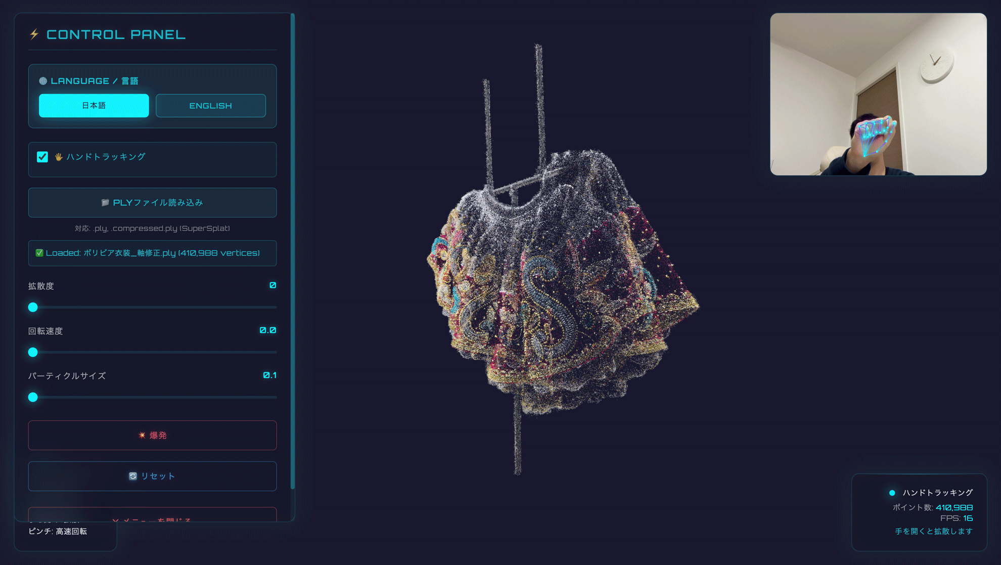 - 手を広げる → 点群がパッと弾け飛ぶ