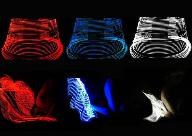 10年以上前、学生時代の小林氏は卒業制作で「人類が電脳化された2045年、人はどんな靴を履くのか」というコンセプトを発表していました。本映像ではこの未来像を、あえて固定された形を持たせず、赤・青・白の光の軌跡として収録。物体としての輪郭を持たない”未来の靴”を、現時点のビジュアル表現で一度定着させた形です。